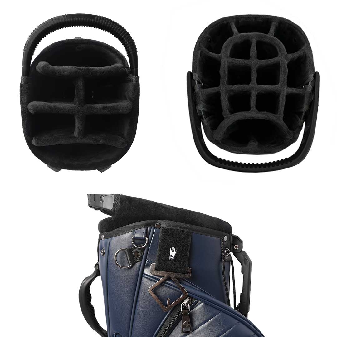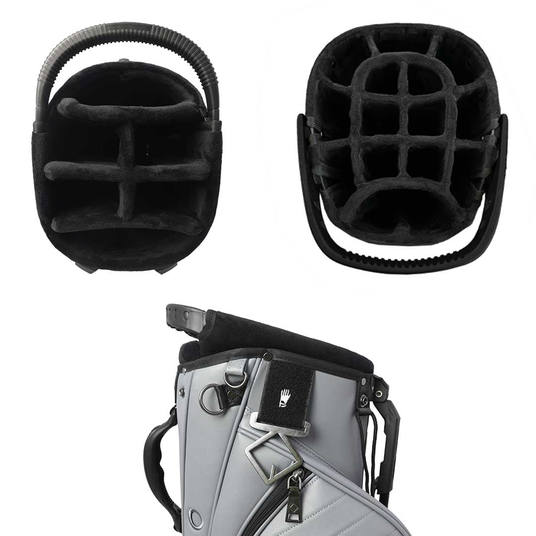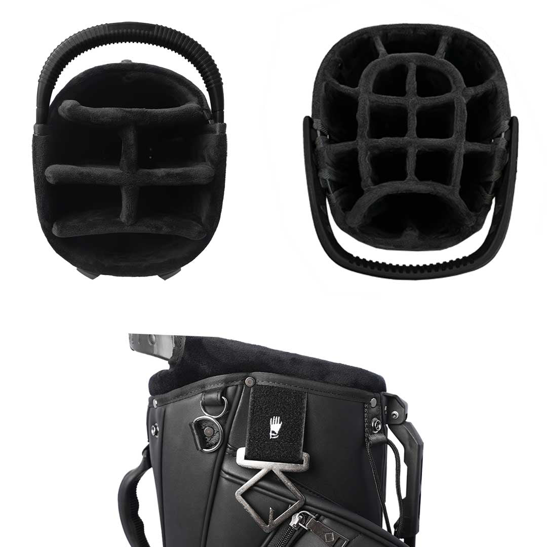 The newly designed 6- and 14-way plush velvet-lined tops provide seamless organization for optimal club retrieval. Full-length dividers extend to the bottom of the bag, preventing club tangling and jamming for ultimate club safety and organization. A secure stay-flat base ensures your bag remains upright, maintaining stability and minimizing the risk of your clubs falling.