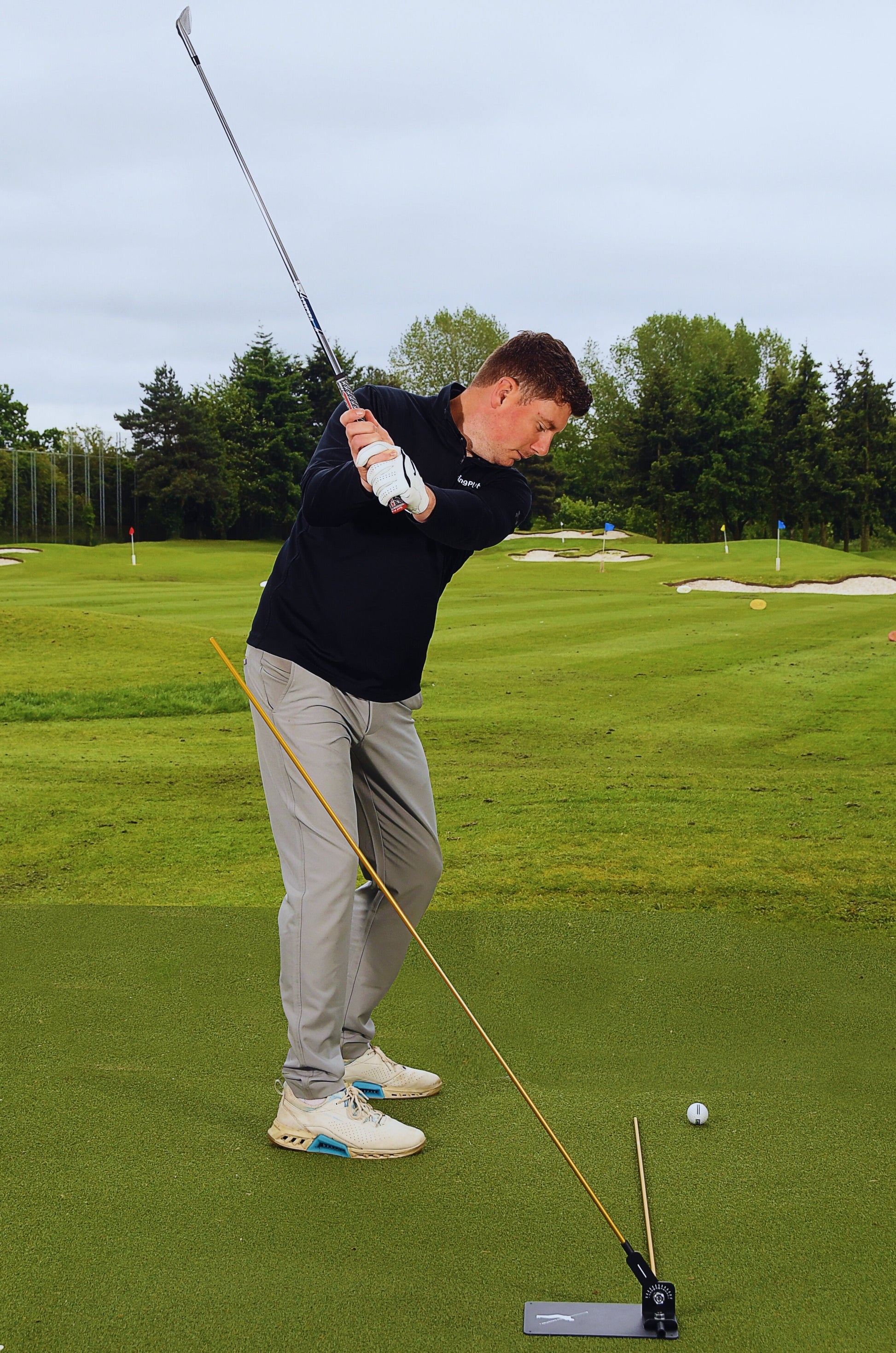 If you have a ‘flat’ backswing; to work on the functional swing plane, simply place a golf ball 1 club-head length away from the alignment stick that’s on the floor & adjust your other alignment stick so it is matching your shaft address position with the club you are using.